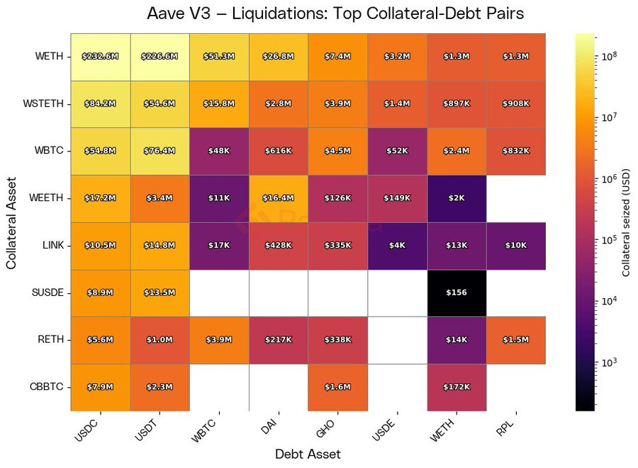 When a user is liquidated, the collateral asset they used to borrow against is seized and their debt asset is repaid. In the below chart, we looked at the top collateral-debt pairs in liquidations to understand common borrowing patterns. Unsurprisingly, the largest concentration comes from ETH-based collateral (WETH, wstETH, WBTC) being used to borrow stablecoins such as USDC and USDT, which account for hundreds of millions in seized value. This reflects the dominant strategy of pledging volatile blue-chip assets to gain dollar liquidity. At the margin, however, we see meaningful liquidation activity in ETH–ETH derivative loops (e.g., wstETH used to borrow WETH) and in the USDC/USDT-SUSDE 'Aavethena' looping strategy.