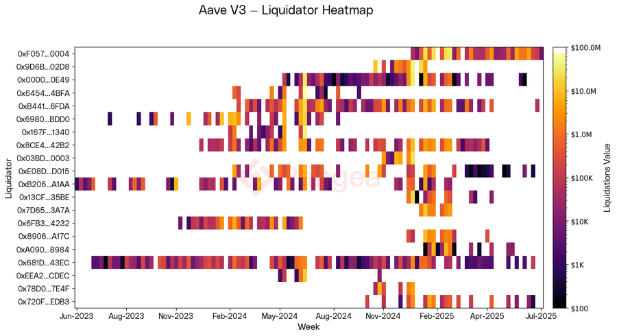 The heatmap highlights these different styles: some liquidators cluster around short bursts of high-value liquidations, while others exhibit consistent activity week after week. This heterogeneity suggests that the liquidation market is not dominated by a single strategy but a mix of opportunistic whales and systematic arbitrageurs.