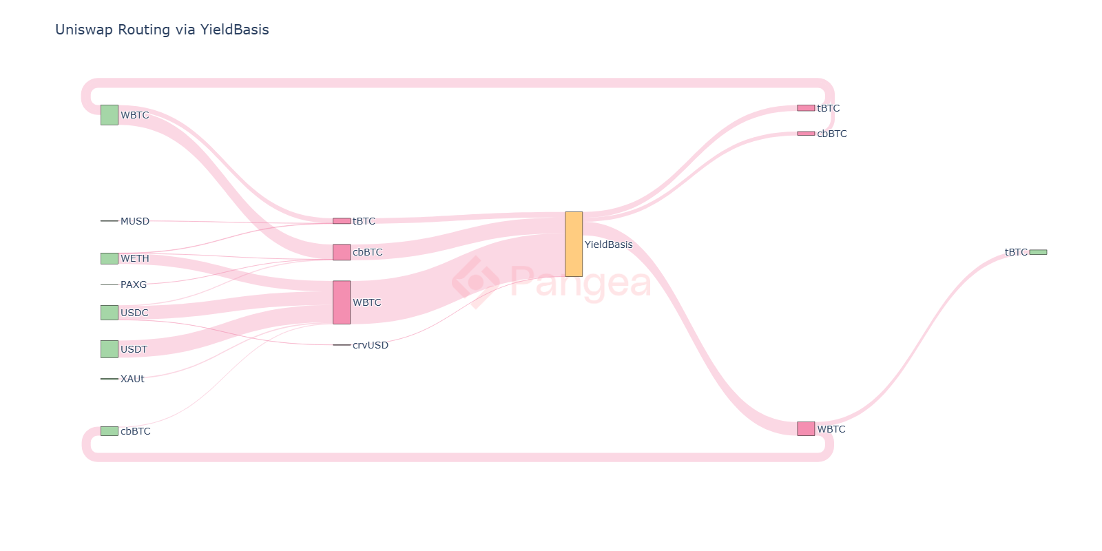 Visualising these flows using a Sankey diagram, we show tokens that were swapped in upstream upstream legs on the way into YieldBasis, and downstream legs on the right. We observe multiple stablecoins feeding the crvUSD ingress, which is the dominant entry point via Curve. The downstream looping back into the upstream tokens is due to arbitrage between YieldBasis pools, in which Curve’s tBTC/WBTC and tBTC/cbBTC pools serve as a bridge and have seen increased volume since the launch of YieldBasis.