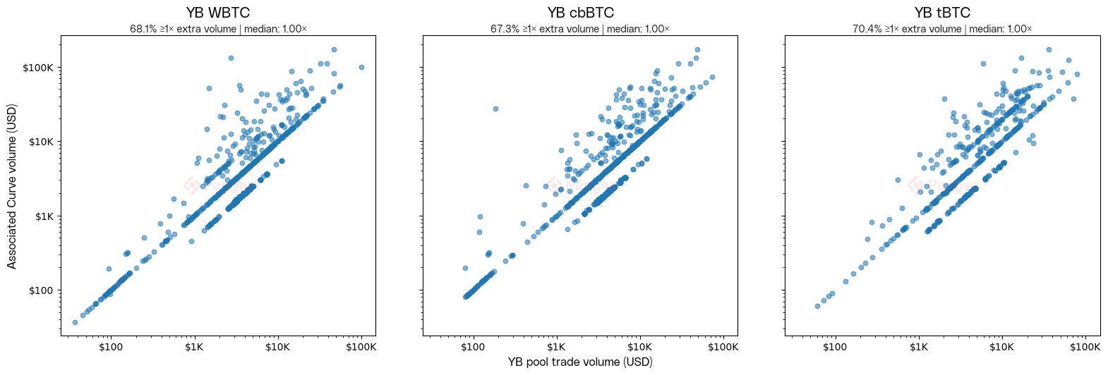 The banding above and below the median is an interesting artifact of our methodology. Each point compares the total YieldBasis volume in that transaction against the total attributable Curve volume. The points below the median are where there are two YieldBasis swaps in one transaction, only one of which has a Curve leg. The band above the median is where a YieldBasis swap has two Curve legs; in fact, all points above the median are due to multiple legs or hops. Note also that transactions with $0 attributable volume are not plotted. All three pools have a median of exactly 1× due to the overwhelming majority of the transactions having a single Yieldbasis swap with a single Curve leg of equal value.