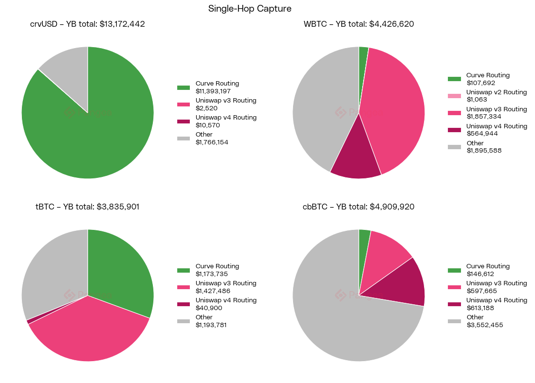 When factoring in multiple hops involving the tokens traded on YieldBasis, we see the WBTC share on Uniswap V3 increases considerably, exceeding the value of the originating YieldBasis swaps. This is corroborated by our other datapoints and is indicative of downstream routing to close out trades into USDC / USDT.
