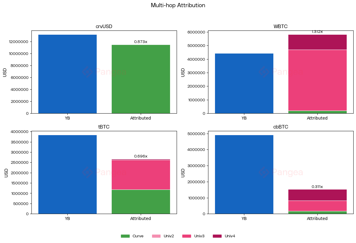 In this case, we attribute all of the volume from the upstream and downstream legs of the YieldBasis crvUSD/cbBTC swap, which has a nominal value of ~$1000. The nominal value of the two upstream legs (USDC/USDT and USDC/crvUSD) is ~$1000 each, whilst the downstream cbBTC/tBTC leg is valued at ~$1000. Supposing that the USDC/USDT swap happened on UniV3 and the others were on Curve, we would attribute ~$1000 to UniV3 and ~$2000 to Curve. That is, every $1 swapped through YieldBasis in this transaction resulted in $1 of flow through Uniswap and $2 through Curve.