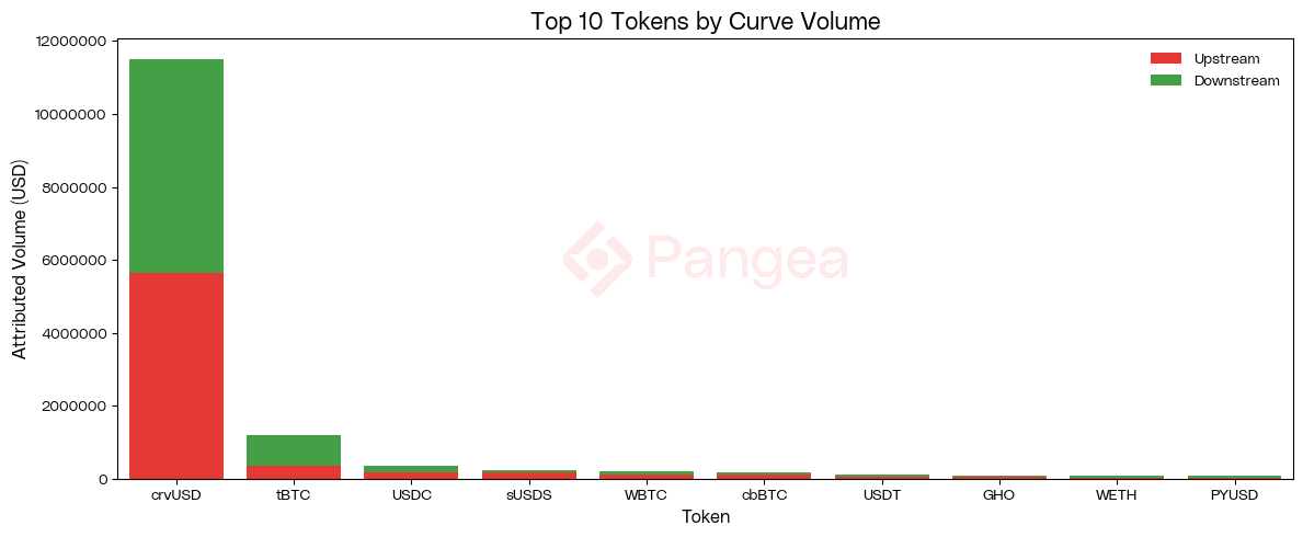 Looking at the breakdown of upstream / downstream routing by token, we can see that crvUSD accounts for >88% of Curve’s attributable volume. The balanced proportion of downstream / upstream volume shows that traders consistently route through Curve’s crvUSD pools on their way in or out of YieldBasis.