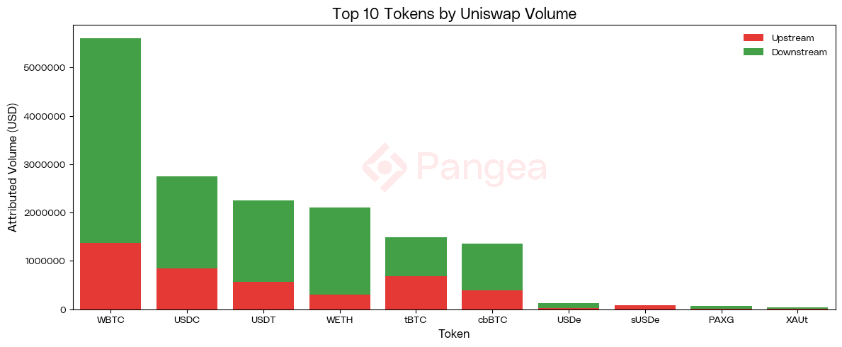 In comparison, Uniswap’s volume is skewed to the downstream side and is mostly accounted for by WBTC, USDC, USDT, and WETH. This is due to arbitrage traders buying WBTC on YieldBasis and then closing out their trade on Uniswap.