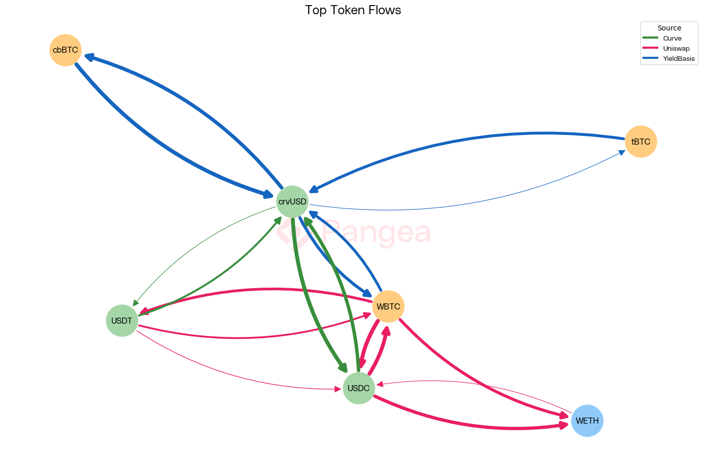 This is further validated by looking at token flows in a network diagram. We see that Curve dominates the stablecoin swaps for crvUSD, whilst Uniswap’s volume is centered around volatile swaps of WBTC for other tokens.