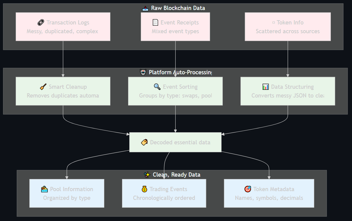 The "decoded"* *field includes the pool object address, the addresses of the tokens, an index identifying which tokens are in and out, the amounts in and out, fees paid, and the pool balances after the swap. This gives us everything we need to stream swap prices. If you find this data confusing, asking the AI for an explanation can be very helpful.